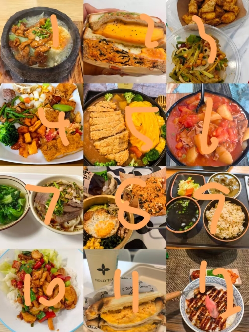 1.商业街石锅泡泡鸡 2.爱达乐那条街彼得潘 3.小吃街的凉拌菜和炸土豆 4.食堂2楼的自选菜 5.商业街蛋包饭 6.虎哥炒饭的番茄牛腩盖饭 7.后街豆瓣抄手的刀削牛肉面 8.商业街北村韩屋的炸鸡 9.商业街台厨道的牛肉饭 10.食堂2楼的辣椒炒肉的小炒鸡 11.外卖好像叫七碗糖水的热压滑蛋三明治和茉莉奶白的白兰椰子水 12.商业街和凤寿司的鳗鱼饭